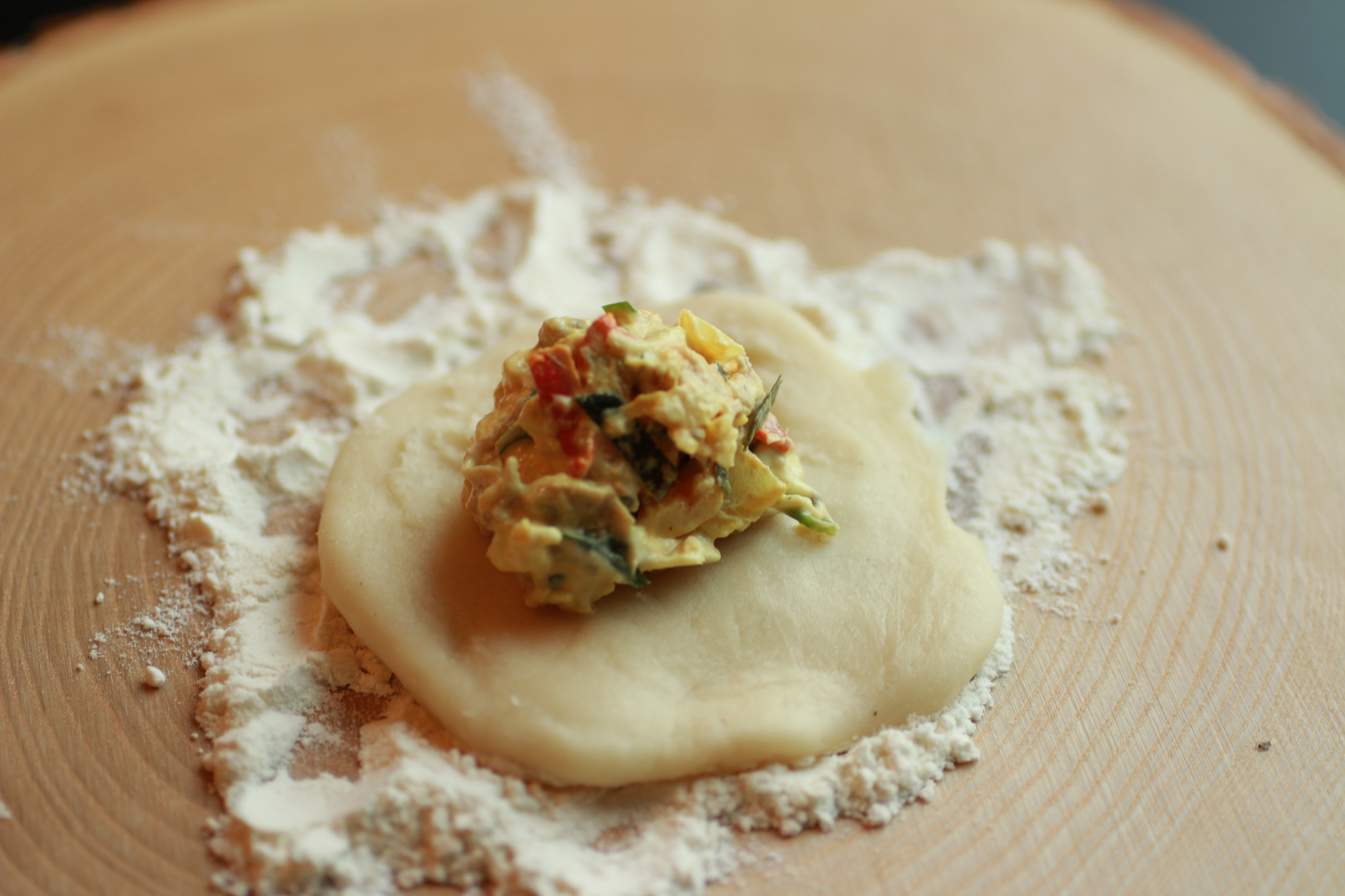 - Als de deeg en de vulling voldoende is afgekoeld neem een bolletje deeg van ongeveer een diameter van 3 cm.Leg deze op je hand en maak deze plat en vorm je hand daarna in een kommetje zodat de deeg ook die vorm aanneemt. Doe daarna wat vulling in het kommetje en vorm het om tot een soort van kegel zie . Even goed aandrukken.